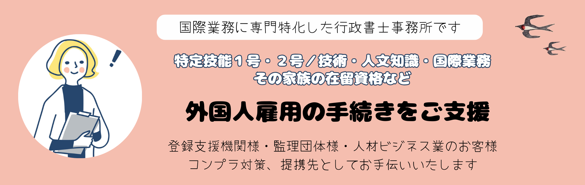 行政書士の仕事は多岐にわたりますが、弊所は入管手続きなどの国際業務を専門としている事務所です。特定技能、技人国、特定活動、留学、日本人の配偶者等、家族滞在、短期滞在等、在留資格各種取り扱っております。